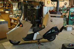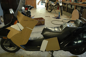 | It is easier to leave the Helix windshield in place so I can go for a ride and see what we have. All the foam board has been hot melted to the Helix and attached with screws and tape. | |||||||||||||||||||