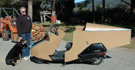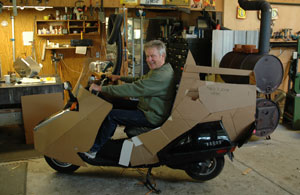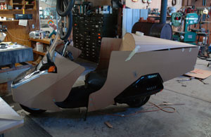 | After tacking together the final shape from little pieces, I trace around it and cut a single piece from a fresh piece of foam board. Tracing is an easy way to cut two pieces... one for each side. I get on and off all the time to be sure I will be able to ride this. No CAD (computer aided design) here. | |||||||||||||||||||