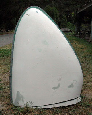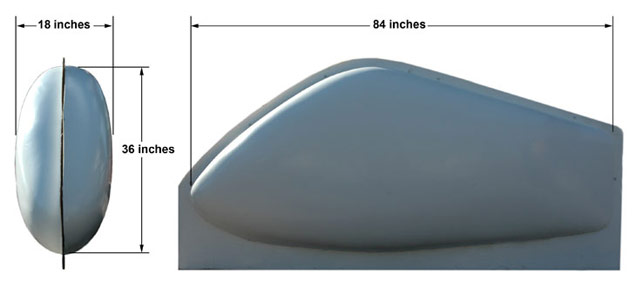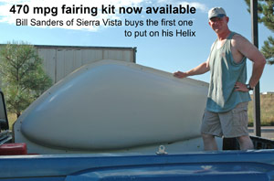 | Kit includes right and left side. Construction: Base white gel coat; one layer of 2 oz. mat, one layer aircraft cloth, polyester laminating resin. My supplier makes his living making airplane components. Total weight: 32 pounds (weight includes the extra flashing left on for convenient shipping) Cost: $1350.00 FOB Salinas, California This is a kit. Like a big model airplane. You should have experience with fibreglass or have a friend who is experienced. Sale is final. No returns. It would be better for us both to exchange e-mails first regarding the suitability of purchasing this. This is why there is no "Click here to buy" button. If a streamlined body like this had been available, I would never have made it. You could not make your own for what you can buy this for. | |||||||||||||||||||||||