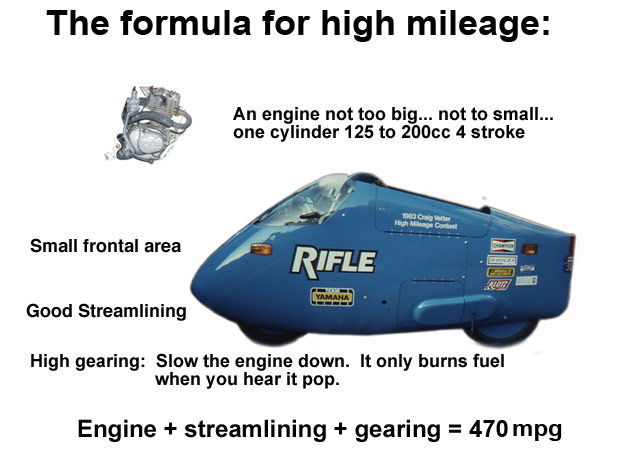 | Important information: I do not mean to make this look too easy. Not everybody got 477 mpg. In 1983, Charly Perethian in the Rifle got 372 mpg. using this fairing. In 1984, Matsu Matsu got 377 mpg. and then 477 mpg in 1985, which was the last year I put on this contest. Any improvement over the typical 43 mpg bikes get would be welcomed The contestants have always been a little reluctant to reveal their secrets. You or I might not be able to get 400 mpg. But, we ought to be able to get better than 43. The above chart presents a good, basic beginning. What secrets did they have? I have interviewed each winner and will offer this info in a book. The world needs this information | |||||||||||||||||||||||