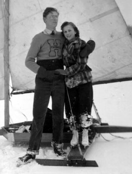| Back in Chicago, Clyde met his wife-to-be, our mom, Doris in 1935. Clyde would ride Doris on the handlebars of his bicycle. Clyde liked bicycles, motor scooters and dogs. He was a great athlete and loved to play baseball in the road with big 16” softballs. He was a noisy kid. “You could always hear him yelling” our mom said. She said they called him ”Potlicker” because he liked to lick out the cake pots. But our mom called him "Bud." Funny... I never asked why. Now it is too late. As they got older, Clyde and Doris would drive to Lake Geneva and skate on the frozen lake. Doris never made it to 5 feet. Clyde was over a foot taller. But were meant for each other. | |