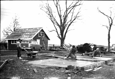 | Clyde was a big man: 6-2 and 220 pounds. He was very strong and did all the work himself. There was no money. There were no contractors... just us and a lot of work. That is my dad, trowling the concrete. Where did he learn that? Behind us (left picture) is the wood storage barn plus a mountainous pile of tarp-covered wood from that old house. The pic on the right shows how we used that old wood to make our garage. Bruce revisited the place in 2009 and reported that the piles of unused wood were still there, 53 years later. | | |