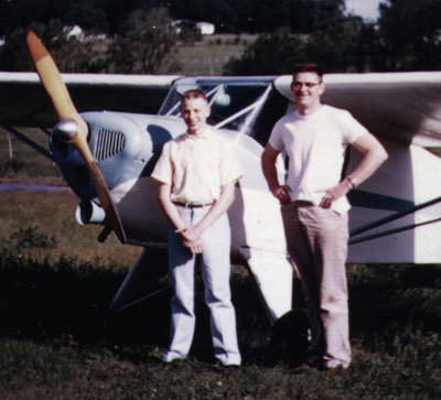 | In 1956, Clyde found a 1940 Taylorcraft airplane that needed recovering and bought it for $300. We learned to fly in it, parking it a mile away at a grass field. Over the winter of 1956-7, we rebuilt it. How did he know how to do all these things? | |