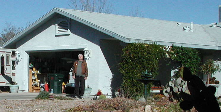 | But in 1988, Doris was diagnosed with cancer. She died in 1993. Clyde was understandably lost for a while... moving here and there. When we went to help him move, we discovered stacks of wood, some under 5 layers of tarps. Those piles just made him happy. Eventually he found a home on a cul de sac in Sierra Vista, Arizona where he lived with his dog Scudder. All his dogs were called Scudder. | | |