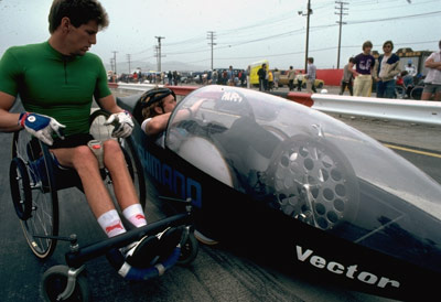 1981: Jim Knaub checking out the possibilities of a Human Powered Vehicle at Ontario Raceway