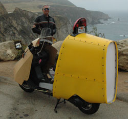 | Do you want a peek at the future I see? "The Last Vetter Fairing" is a streamlined, teardrop shaped design, built over a standard Honda Helix. It will provide maximum everything... most fuel economy, the best rider protection and most carrying capacity of any two wheeler ever made.