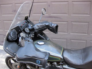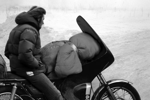 | We enjoyed life on the road... camping out, sleeping under bridges, etc. Up to then, the weather had been balmy, most unusual for the dead of winter. Soon after we left Houston, however, it rapidly became cold and wet. By the time we passed Little Rock, we were not happy. Worse, the forecast was for 7° above zero in Illinois. We had no choice but to go on. Crossing into Illinois, the north wind picked up and we began to freeze. It was in the low 20s and beginning to snow. We were dressed the best we knew how, in army surplus military clothing. After all, didn’t the military have the best equipment? The big barracks bag on my tank was stuffed with everything needed for two weeks, and it helped to keep me warm. My goose down jacket over a military OD wool sweater worked pretty well too. Our Vetter Phantom fairings did a good job in keeping the cold wind off us. However, my wool military liners inside welder’s gauntlets were not up to the freezing wind. My hands were getting cold. As a young designer, I had come to learn: “It is easy to solve a problem once you identify the problem” The problem was cold hands. The cold wind was taking the heat from my hands. The solution was to create a still-air insulating space around my hands so the wind could not take my heat away. How would I do that? More important, how would I do it right now, on the road when I needed it?I was carrying my military goose-down mummy sleeping bag, which, was insulated and wind resistant. It was rolled up, stowed away, doing nothing. I imagined how it could be formed in front of me to provide pockets for my hands and arms to slip into. At the next gas stop, I bought a roll of duct tape and went to work, which was hard with cold, non-working hands. I shaped the ends of the bag into pockets around the controls and my hands. I made openings just big enough to put my arms into so no air could get in. Then I duct taped the sleeping bag into place. | ||||||||||||||||||||||||||||||||||||||||||||||||||||||||||