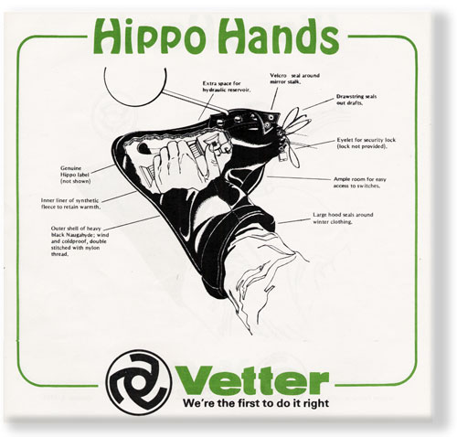 | Amazingly, Hippo Hands are still remembered, in spite of the fact that not a single set has been made since 1981. We hear that other people are making Hippo-like thingies. Considering our passion for design and quality, I doubt very much that there is anything as thoughtfully designed or made as well as the Hippo Hands my brother and I produced. No matter what you might hear elsewhere, there is no genetic link between anything on the market and Genuine Vetter Hippo Hands... | ||||||||||||||||||||||||||||||||||||||||||||||||||||||||||