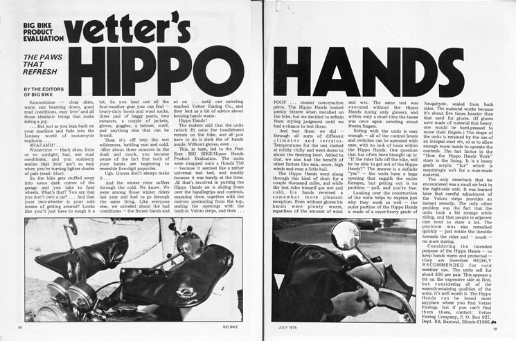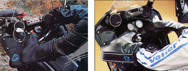 | Marshall writes: Thanks for the history! I just installed a set of the soft-sided Hippo Hands on my '81 Yamaha XS1100LH this winter, and they are almost perfect! Got them on ebay this last summer for somewhere around $30, and they were filthy! A run through the washing machine cleaned them up, and now they look almost brand new! I had to sew the velcro back on, where it wraps around the handlebars (the drawstring area), but that was easy. The lining is still creamy white and the Hippo-dermus is still shiny black. Do you recommend treating it with anything special to keep it soft, supple, and waterproof? The main reason I wanted to write to you is that I was stopped at a gas station the other day, and the temps are below freezing here in St. Louis. Needless to say, I see very few bikes these days. I was dropping a couple fountain drinks into the cup-holders I keep in my Vetter saddlebags, and I see another rider (helmet in hand) walk around the front of my bike. He noticed the Hippos, and I could almost see him drooling over them. He wanted to know where he could get a set, because his hands were FREEZING on his mid-'80's Goldwing. I had to tell him they were no longer made, and to check on ebay for the "real Hippo Hands, made by Vetter". I know other companies are using that name for similar products, calling themselves the "original", but nothing surpasses the quality of these things! I may invest in a set of the hard-sided ones for next winter, as the brake reservoir requires me to keep the snaps open on the right side, but I can still wear my summer gloves in them. The only thing that gets noticably cold now are my knees behind the lowers on my Windjammer. Thanks for your great products! | ||||||||||||||||||||||||||||||||||||||||||||||||||||||||||