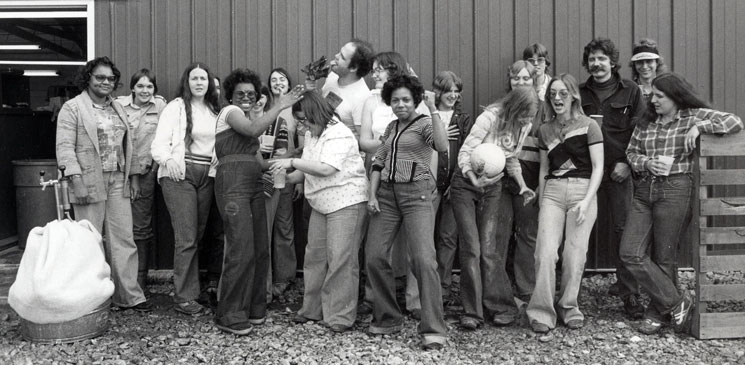 | Resourceful and compassionate workers of the Hippo Hand factory, 1976 Bruce says, "We did well because all employees took the Hippocratic oath to make all Hippos ethically." Brother Bruce is second from the end, back right. Initially, the suggested price of Hippos was $30 raised to $39 by 1975. ($39 is the same as $158 in 2010 inflated dollars) There was no price posted in later years because bureaucrats made it illegal to suggest a retail price. In any case, sales of Hippo Hands doubled every year. | ||||||||||||||||||||||||||||||||||||||||||||||||||||||||||