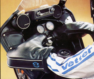 | Hydraulic front disk brakes put big reservoirs on the handlebars. In 1978, we redesigned Hippo Hands to accommodate the changes in motorcycles. By now, Hippos had become mainstream. If you lived in the cold, in the winter, you got your Hippo Hands out and snapped them on. It was easy. Hippo Hands allowed you to ride all year long. In every way, Hippo Hands helped to make motorcycles better transportation, which, of course, was my reason for being in business in the first place I sold Vetter Corporation at the end of 1978 and things began to go bad. Because of a deteriorating relationship with the new owner, my brother stopped manufacturing for the company. In January of 1983, the owner declared bankruptcy. | ||||||||||||||||||||||||||||||||||||||||||||||||||||||||||