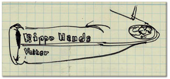 | Janet Kloock was a talented graphics artist from the U of Illinois. She produced the famous Hippo Hands logo. I don’t recall ever registering the name, “Hippo Hands.” Why waste the money? Who else would ever want to use such a name? The original bronze empossing die that branded a thousand Hippos was made by Everhot of Chicago. They were famous for branding horses, too. The die cost $350 in 1975 which is equivilant to $1,350 in inflated 2010 dollars. Development continued slowly, mainly because we were swamped with orders for Windjammers. I still wasn’t sure we had a product to sell in Hippo Hands, so there was no rush.
