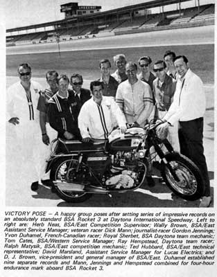 | Don again: To kick off the BSA campaign, I got an agreement from AMA president, Bill Berry, to officiate record attempts with the Rocket 3 at the Daytona Speedway. We leased the Speedway April 2 through 5, 1969, and hired Dick Mann, Yvone Duhamel, and Ray Hempstead for long-distance speed record attempts. These attempts were being made because our service manager, Herb Nease, told me he thought the new bike could go as fast as 130 mph if it was set up carefully to exact factory specifications. That got my attention because I respected Herb's opinion on such matters. | |||||||||||||||||||||||||||||||