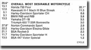 | Survey from August, 1969 Cycle Magazine | |||||||||||||||||||||||||||||||