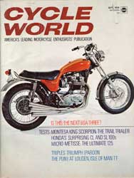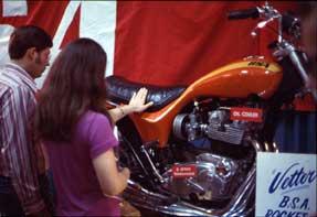 | Craig continues: The bike appeared on the famous September 1970 "white cover" issue of Cycle World with the caption, "Is this the next BSA 3?" Joe Parkhurst, founder and editor, later told me that this was by far the most popular edition of CW to date and that all extra copies were sold out also. After the photo shoot for Cycle World, the bike was displayed in their lobby for a while. Between January 29-30, 1971, BSA displayed the Vetter Rocket 3 at the Houston Astrodome trade show, and then it was stored in Anaheim by my friend, Darryl Bassani, until he delivered it to me in Illinois. | |||||||||||||||||||||||||||||||||||||||||||||