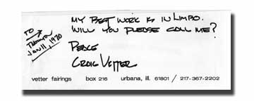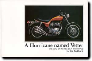 | Craig continues: In 1978, after Joe Parkhurst sold Cycle World, I hired him to write the story of the Triumph Hurricane. A thousand copies of "A Hurricane Named Vetter" were printed, one for each of our Vetter dealers. But I sold the company before the books were delivered. Today I have a few still in their original 1978 packing boxes (They are still available at: http://www.craigvetter.com) . | ![]() | ||||||||||||||||||||||||||||||||||||||||||||