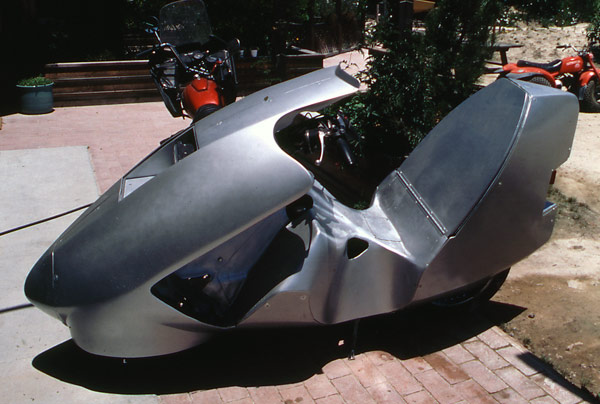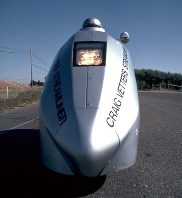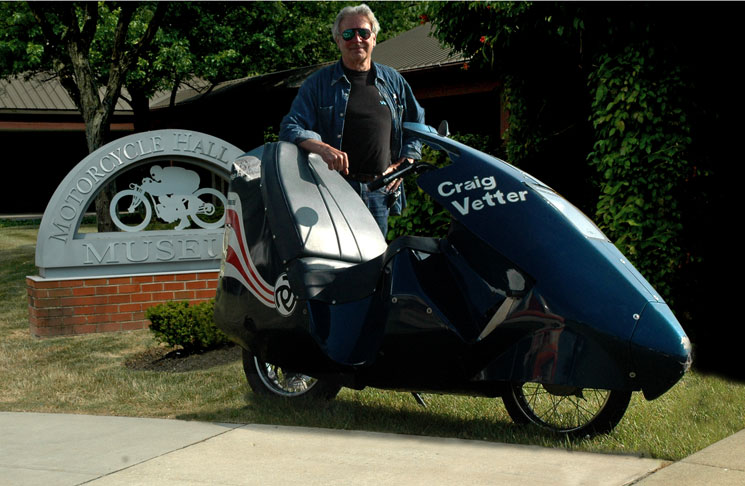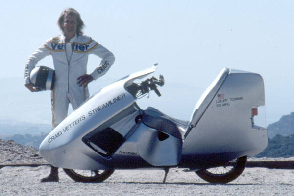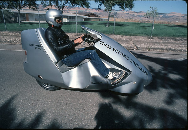 ![]() | How is that for a name? High Mileage Luxury Touring Motorcycle. What does it mean? Here is the story: In 1964, when I began designing, motorcycles got 43 miles per gallon and cars got 10. It is why I designed for motorcycles. But by the early 80s, motorcycles were getting less while cars like Honda's Civic were getting more. This was embarrassing to me. Where was our advantage? I decided to design and make a very high mileage motorcycle with a twist: It would also incorporate maximum comfort and storage. Thus, "High Mileage Luxury Touring Bike". This led to the "Craig Vetter Fuel Economy Runs" of the 1980s. Which led to 470 miles per gallon. This machine is now in the AMA's Hall of Fame Museum. | ||||||||||||||||||||||||||||||||||||
