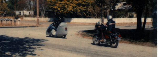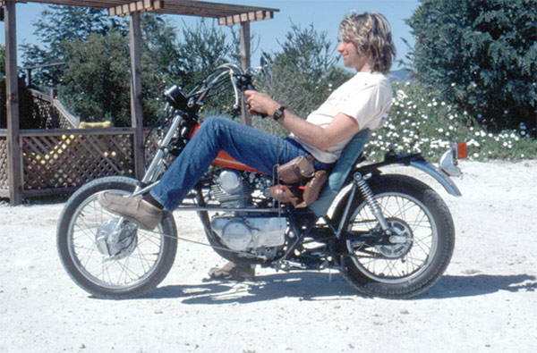 | In 1981, thought that 250cc would be the right size engine to push a man down the road at real highway speeds. Kawasaki generously donated a couple of single cylinder four stroke KZ250s. The first step was to hack it up so as to get the rider into a comfortable position. For me, it is the "Lazy-Boy" recliner attitude. So, I put myself in that position and re-arranged the little Kawasaki to hold me. Bob Seim was my fabricator on this project. I reclined and Bob cut and welded the bike around me. Note the forward controls. | |||||||||||||||||||||||||||||||||||||