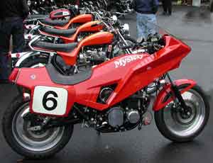 | How is this for a rare sight? A Mystery Ship, three Triumph Hurricanes and an original BSA Rocket 3! What we have here are some of the motorcycles that appeared at the AMA's First Annual Hall of Fame Concours. You can see here the influence of "tail-dragger" airplanes in Vetter designs. It is an agressive stance... poised to take off. | |||||||||||||||||||||||||||||||