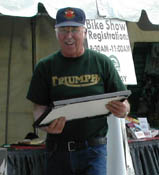 | Frank Powelson of Brooklyn, MI walked away with first prize for his beautiful 1973 Triumph Hurricane. A very proud Mark Mederski officiated at the awards. It sure was hot that July day in Ohio! | |||||||||||||||||||||||||||||||