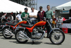 | Two beautiful Hurricanes showed up at Sears to delight the crowds. On the left in the hat is first place winner, Bill Whalen. On my left is Duane Anderson (maroon shirt) who helped me build the original Vetter Rocket 3 in 1969. Along side Duane at the far right (green shirt) is Kim Rowden, owner of the 2nd place Hurricane. | |||||||||||||||||||||||||||||||