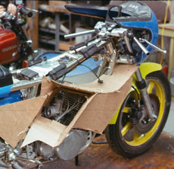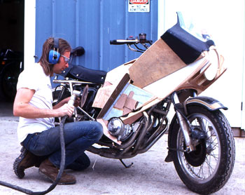 | I pulled a Honda 750 Rickman frame out of inventory to begin the Mystery Ship. The idea was to design and make the most wonderful sport-touring motorcycle in the world. You can see in this picture a little piece of Windjammer windshield in place to guarantee that a stock Windjammer windshield would fit. About this time Derek Rickman paid a visit from England. | ||||||||||||||||||||||||||||||||||||||||||||||||