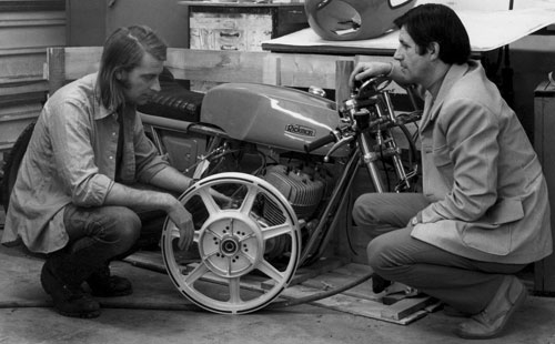 | Tony Salisbury, my new General Manager, came from BSA, which, at the time, was being phased out along with the Rickman product line. With Tony, came Rickman, if we wanted it. I thought that the Rickman Cafe Bikes would be a good fit, but not the dirt bikes. A deal was struck and in March of 1975, wooden crates of beautiful, nickle-plated Rickman frame kits for Triumph 650s, Honda 750s and Kawasaki 903s began to trickle into our Rantoul, Illinois warehouse. The Rickman frame would become the basis of my next project, the world class design "Mystery Ship" Before all this had taken place, I reasoned that I could be a better designer if I really knew how to road race. "After all, how could you design a world class motorcycle if you did not know how to race?" | ||||||||||||||||||||||||||||||||||||||||||||||||