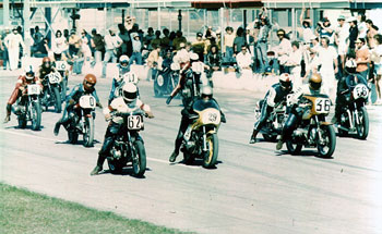 | Daytona, 1976 I waited until the starter's sign was turned sideways before I pushed the starter button. Everybody else had cooked their engines, revving them at the starting line. I shot out so fast that I drove off the track on the first corner! I placed 3rd behind Lang Hindle and Mike Baldwin. | ||||||||||||||||||||||||||||||||||||||||||||||||