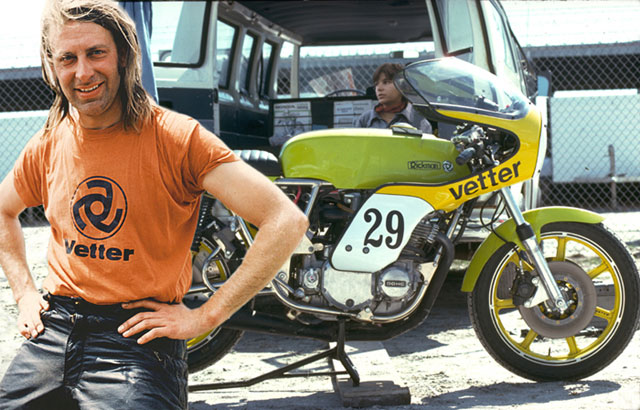 | 150 mph scared me so, after Daytona, I pulled the killer Kawasaki engine out and installed a Ron Grant Suzuki 500 air cooled twin. I was working on very radical air ducting when I crashed at Road Atlanta on my Production RD350. That was the end of racing for me and the end of Rickman for Vetter. I traded off the RC Kawasaki engine, replacing it with a stocker, restoring my racer to its Daytona condition, figuring I would drive it on the street someday. I never did. In 1998, the bike was donated to the Motorcycle Hall of Fame Development of the Mystery Ship was to continue on a new and different platform, that of the Vetter AMA 1978 Superbike Championship bike as ridden by Reggie Pridmore. | ||||||||||||||||||||||||||||||||||||||||||||||||