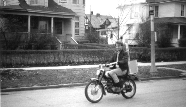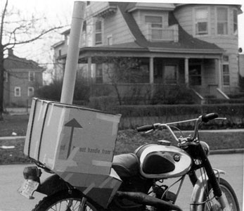 | In the 1960s, I raced my Bridgestone 90 on the streets of Champaign, Illinois. Things were different then. An open tuned pipe can be very loud so I invented this early CAD (Cardboard Aided Design) muffler. Three cardboard boxes were inside. The exhaust blew into the inner box which had a small hole on the opposite side to leak out of into the next box and so on. Eack layer was lined with paper mache egg crate dividers. The final cardboard chimney exhausted straight up. It was very quiet and, no, it never caught on fire. It was my mini bike muffler that caught on fire. | |||||||||||||||||||||||||||||||||||||||||||||||||||||||