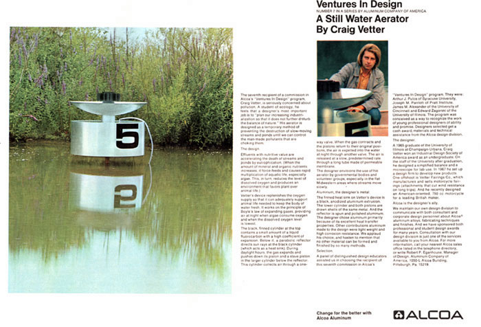 | In 1970, Alcoa approached me, as an aspiring young designer and asked me to design something special out of their aluminum. My first idea was the Ram wing, above. But I simply did not have the time or resources to sort the Ram Wing out. With a deadline looming, I decided to invent a sun powered air pump that would help to keep ponds from scumming over with algae. The Still Water Aerator automatically cycled a big rubber diaphram up and down, inside the aluminum can, taking big gulps of air and pushing that air thru submerged tubing at the bottom of the pond | |||||||||||||||||||||||||||||||||||||||||||||||||||||||