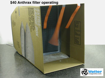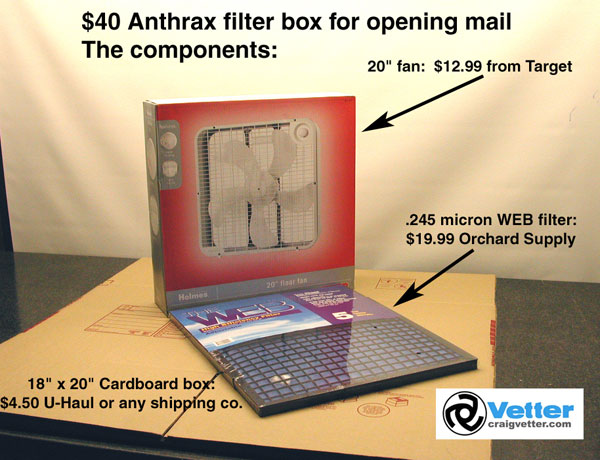 | 2001 October: I designed and made this inexpensive Anthrax Mail Fliter Somebody was sending mail with anthrax dust in it. Pretty scarey? This Great Idea was to show folks how to make a $40 filter that could be used safely indoors to open mail. I actually had a web page dedicated to this. It seemed like a smart thing to do. | |||||||||||||||||||||||||||||||||||||||||||||||||||||||