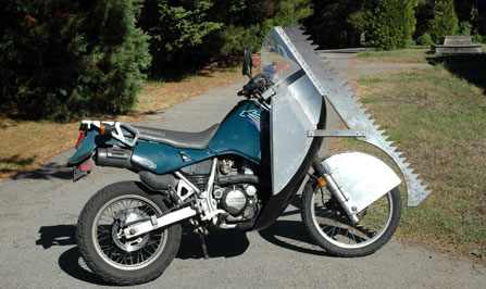 | 2007 Energy Absorbing Device A friend, Henry, rounded the corner on his BMW to find a mountain lion in his path. The impact killed the beast and put Henry in the hospital with a broken collar bone. It would be better to be able to absorb such an impact more gradually. Therefore, I designed this frame-mounted device. Fortunately, I have not had to use it. | |||||||||||||||||||||||||||||||||||||||||||||||||||||||