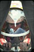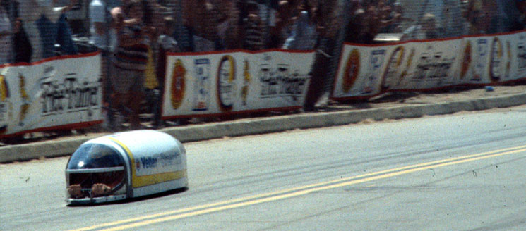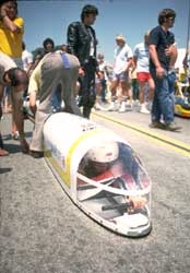 | There were very strict rules for this contest. But the idea for going fast, as always, was to minimize the frontal area, keep it aerodynamically slippery and minimize rolling resistance. For good handling, you must also keep the weight as far up front as possible. Of course, it was required that you had brakes. We used a parachute and skuff pads that rubbed on the road (aero space and wagon wheel technology). | ||||||||||||||||||||||||||||
