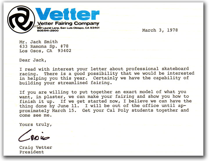 | One day in 1978 Jackie Smith, a Pismo Beach skateboarder (snowboarder and sandboarder), asked if I would sponsor the design and construction of a racing skateboard. He said that a big race was going to be held at Signal Hill (near Los Angeles) to see who was the fastest. "Sounds good to me," I said. I like a good contest. Cycle magazine graciously donated some money and we were on our way. I had no idea of what we were in for. | ||||||||||||||||||||||||||||