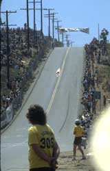 | Signal Hill is very steep. The picture does not do it justice. At the bottom is an intersection of another road with a hump which could launch the faster boards into the air and cock them sideways. If you were not exactly in the center of the road, you would go head first into the curb. Many contestants and skateboards were shattered there. | ||||||||||||||||||||||||||||