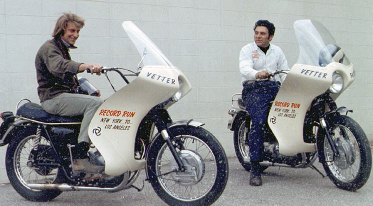 | Oct 27, 1968: Vetter fairings ready for a “Record Run” from New York to Los Angeles. There I am, age 26, contemplating a "Record Run," glad it wasn't me going on it. Corky Rich and Eric Marcus’ talked me into supplying a Series 1000 fairing (the Triumph I am sitting on) and a Series 1500 fairing (on Eric's bike) for a proposed speed record. This is a pretty good shot to see the differences between the Series 1000 (lft) and the Series 1500. "This will be good PR", they said. I never saw them again. Corky, Rich... you out there? What actually happened? | |||||||||||||||||||||||||||||||||||