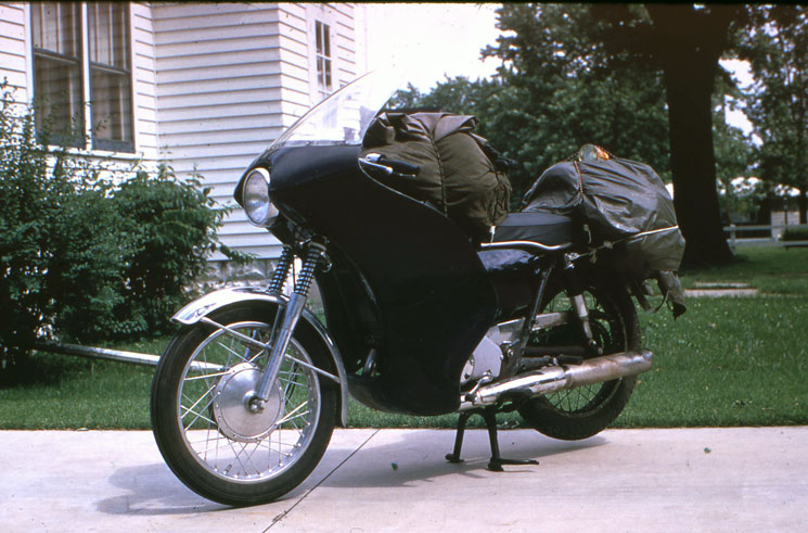 | Duane Anderson's Series 1000 Vetter Fairing on his 1967 Yamaha 350 This is a very early Series 1000 Vetter Fairing. You can tell because the windshield on those first fairings were very steeply raked. Duane worked with me at Vetter. He liked this fairing because of the low windshield and trimmed it down even further. The sides are clipped about 2" per side and the windshield was shortened. The military poncho kept our stuff dry on the bike and on the ground. This is how we rode in those days. | |||||||||||||||||||||||||||||||||||