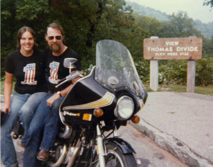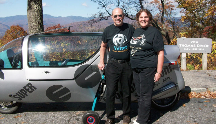 | Dan says: "Streamliner motorcycling today... Thanks to the realities proven by original Vetter Windjammer." "Rosina was the 25 year old anchor lady at News 12 (Richmond VA). I was the 34 year old wrench at my Dad's Harley shop (Petersburg VA). We met when she came to cover H-D Chairman Vaughan Beals visit to try my prototype single fire ignition on his electraglide across thebredth of VA. Soon after we decided to vacation together on a bike trip to New Orleans. Two weeks and 3000+ miles later we had this picture taken at Thomas Divide in the Smokie Mtns. The fun we were having shows in this picture. In spite of a 70MPH fall in the rain near Atlanta, of which the chrome strip in the Windjammer took the brunt without other damage to us or the bike, We were having the time of our lives. The Windjammer proved what a difference streamlining could make in comfort, fun and utility (doubled my annual mileage). The Windjammer started my fascination with wind cheating motorcycling." | |||||||||||||||||||||||||||||||||||