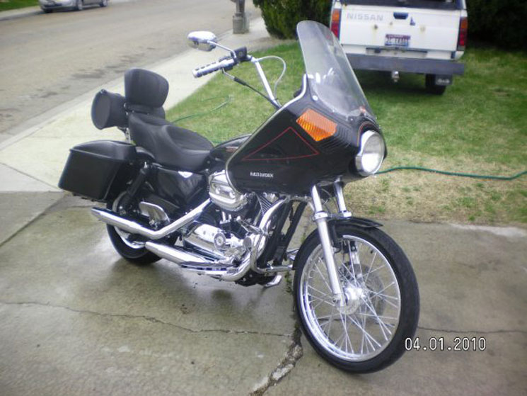 | Let me start with just a little story. We bought this xl1200c new last year our intent was to do a lot of traveling which we did. Our first trip around 1000 miles we did just as it came from the factory and although i love to ride i felt beat up after hours of freeway speed. The next 1200 mile or so trip i tried a small windshield at that was as bad if not worse than without. I did a here and there with some lowers and such and got it to where it was bearable, put on 10,000 miles last year and every trip thought there has to be something better. i got to looking and fork mounted fairings and was not impressed with the reviews. then your fairings came to mind so i started to do some research on availability and such. we found a good price on one and bought it immediately. | ![]() | |||||||||||||||||||||||||||||||||