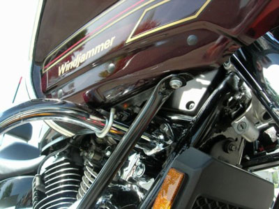 | I fashioned some new mounts that attach to the engine protection bars, and then some slanted braces that attach back down to the footpeg area. I had to cut about 1/2 inch around the front side of the inner "well" so as to have enough fork clearance. I reinforced the sides with 1"wide steel bar stock top and bottom and then put rubber mounts anywhere there was metal/bolt contact. It performs flawlessly. Ran it up to 80 mph yesterday and it is rock steady. She is soooooo happy, and wants to thank you for your beautiful design, It is timeless. | |||||||||||||||||||||||||||||||||