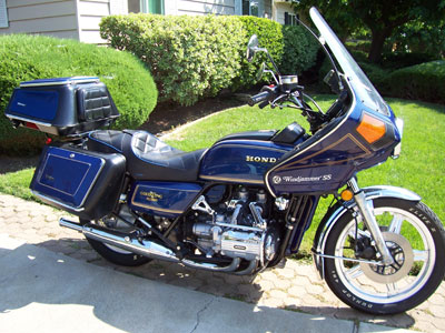 | Mike says: "Here is a pic of my Vetter equipped 1975 Honda GL1000 Gold Wing that I won the trophy at the Gold Wing Road Riders Colorado District Rally last weekend. I bought my '75 Gold Wing from the original owner 18 years ago back in New Hampshire. It stayed a stock motorcycle until about 4 years ago then I decided to make it a full dress tourer." Mike says that the saddlebag brackets from a 1979 GL fit perfectly but the Tail Trunk bracket had to be modified to clear the seat. | |||||||||||||||||||||||||||||||