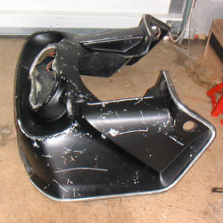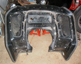 | This is one heck of a fairing! Can you imagine the comfort? Notice the instrument panel. We used VDO gauges and sending units. A complete Liberator also has the plastic panels that cover the big opening where the forks turn as seen above. In addition, we included an additional tonneau that bridged the big gap between the two sides. All this is more completely clarified in the original Liberator Mounting Instructions which you may download. | |||||||||||||||||||||||||||||||