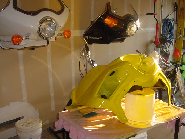 | James is like me... he collects Windjammers White Windjammer III: # 09-119311 Yellow Windjammer SS: 24-277188 Craig: Today I finally took the leap into the world of paint. Bear in mind that a can of Krylon has been the limit of my painting experience, so a real spraygun and PPG paint is a new experience for me. I was impressed at how difficult it was to remove the Vetter logo when prepping the fairing. Built to last ! | |||||||||||||||||||||||||||