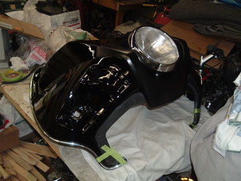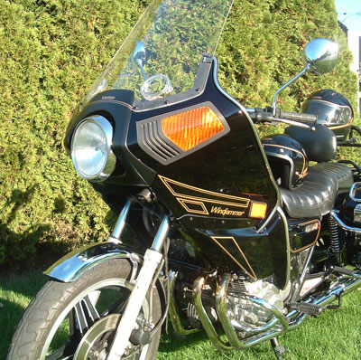 | I did all the work myself including the paint work which is done in Dupont Acrylic Enamel as is the rest of the bike (which I painted 10years ago), I have had it for over 10 years but it needed major work to get it looking good again. So I started by taking scans, pictures and rubbings of all the graphics. Then I had to source the bits and pieces to fix it up, mostly off Ebay. Then I had to repair two cracks in the fairing, both on the left side, one from the pocket out to the left (picture attached) and one from the front of the pocket leading up towards the front. They were both reinforced with ABS cut from a donor fairing and Hotcha glued into place. So it was completely disassembled and painted and reassembled. I installed the optional horn kit and have a Cycle Sound radio enclosure for it that I just haven’t quite got on it yet. I added reflectors on the sides of the fairing off an 80 Honda GL1100 (the rear bags are off a GL1100 as well). I had to reshape the bezel to fit the Windjammer contour. I sourced some NOS parts for it, the radio front door and the lowers (which just happen to be lucky and be black, so I didn’t even have to paint them). I shortened the graphics and did away with the red stripe as I have no red on my bike. I applied new Vetter wording and stripe on the mask and Windjammer wording and stripes on the sides. I used the older SS chrome headlight ring. I have a black NOS one but thought the chrome one suited the bike better. | | |