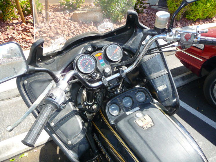 | I discovered that the bike had a mixture of 75 and 76 carbs on it, which kept it from running correctly. I purchased 78 carbs off the Internet, boiled and rebuilt them, I got a new seat cover, then realized that I should restore this bike. I had the heads polished and cleaned, new valve seats and valves, and a new electronic ignition. I recently rebuilt and synchronized the carbs, and took it for the first test ride. I now live in Las Vegas, and got a flat on the test ride, in the middle of nowhere (60 miles from civilization in the middle of the Mojave Desert Mountains. Luckily there were a bunch of cowboys near me shooting in the desert (guns), and after I heard the gunfire, I tracked them down and asked them for help, which they provided. Bike is now fixed, and I decided to restore this bike, which only has 13.5K miles on it (original). I have found many original parts on-line, including turn signals and non-fairing parts, so I can run it both ways(full dresser and naked). I am really excited about the restoration, including the Vetter restoration, as it is retro and original to the era. The originality of the Vetter is important to me, as it makes the bike look like the era, which is important to me. I stopped for gas outside Vegas, and 4 Harley riders stopped over to chat about my bike. Now that it is running great, I can't wait to turn it into a show bike. | | |