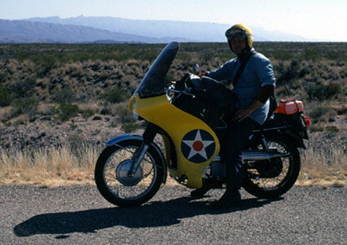 | Jim Miller was my college buddy and Head Cooridinator at the fairing company. Here he is close to the Rio Grande in Texas in the winter of 1971. He took the long way to the Astro dome races. Jim died in 2001. | |||||||||||||||||||||||||||