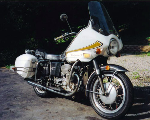 | Thomas Bailey's 1973 Windjammer II, serial number 16009 on his 1972 Moto Guzzi Eldorado. In order to put a Windjammer on this bike, we had to put in these cut outs for the crashbars. We called them "Mouse-holes" at the factory. | |||||||||||||||||||||||||||