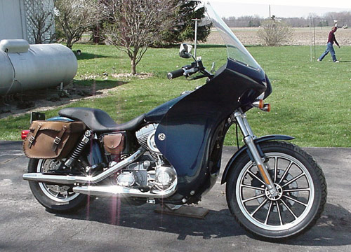 | Here is a Series 1500 Phantom fairing on a Dyna. When I saw this, I was astonished at how good it looks. Only about a hundred of these Phantom Series 1500 fairings were made, between 1968 and 1971. Most were put on Triumph 650s, Honda 450s and Yamaha 350s. Rick makes me want one like this, too. | |||||||||||||||||||||||||||