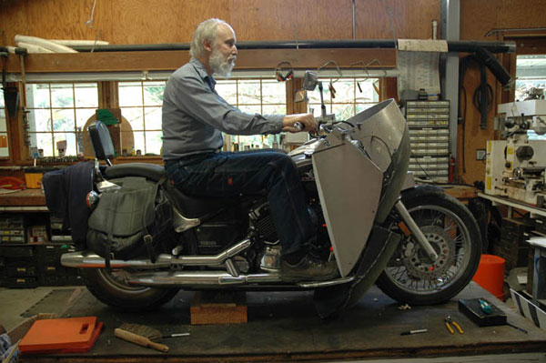 | My friend Larry loves his Yamaha V-Star. Would the Alcan fairing work on his cruiser? His bike has very different proportions. His seating position is very different. There is not much is similar to the KLR or BMW. However, my fairings are designed for people, not motorcycles. We people are a similar sze. Will it fit? Stay tuned and find out. | |||||||||||||||||||||||||||||||||||||||||||||||||||||||||||||||
